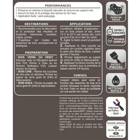 Huile & Protection V33 Argent mat prĂ©serve et valorise la beautĂ© naturelle et l’aspect mat de vos meubles et boiseries Ă l’intĂ©rieur de l’habitat. Cette huile nourrit le bois et le protège des taches et de l’eau. Vous pouvez alors facilement lessiver vos meubles, en conservant la protection et l’aspect du bois.