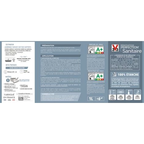 Le système V33 (Peinture + Protecteur) destiné aux sanitaires, lavabos, baignoires, bacs de douches, bidets en :