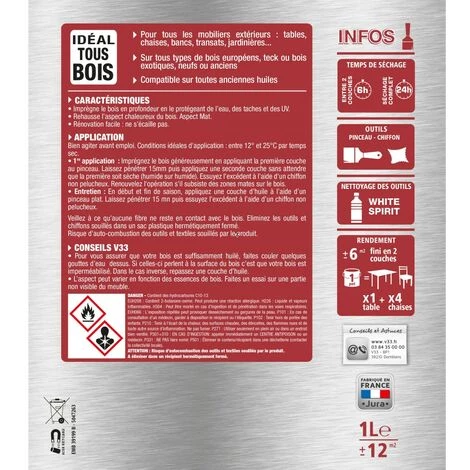 Une huile conçue pour nourrir en profondeur le mobilier de jardin en bois, quelle que soit son essence. Elle protège durablement vos bois de l’eau, des taches et des UV tout en rehaussant son aspect chaleureux. Facile Ă appliquer, elle ne tache pas les vĂŞtements, ne s’Ă©caille pas, et peut ĂŞtre utilisĂ©e sur bois dĂ©jĂ huilĂ©s.