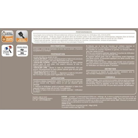 Un vitrificateur incolore satinĂ© spĂ©cialement formulĂ© pour les escaliers, rampes et balustrades, très rĂ©sistant aux passages frĂ©quents et aux chocs. DotĂ© d’une formule anti-glisse, il limite les risques de chute dans les escaliers. Sa texture gel anti-goutte le rend très facile Ă appliquer.