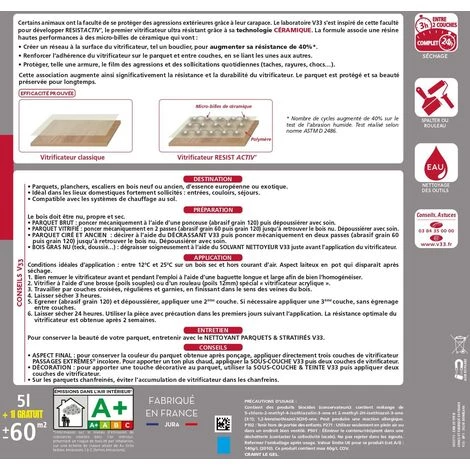 Passages ExtrĂŞmes® – Technologie CĂ©ramique V33 vitrifie vos parquets, planchers et escaliers en bois pour une protection durable. La technologie cĂ©ramique que ce vitrificateur V33 contient assure une rĂ©sistance renforcĂ©e et protège vos sols contre les agressions quotidiennes (passages rĂ©pĂ©tĂ©s, rayures, taches et chocs).Â